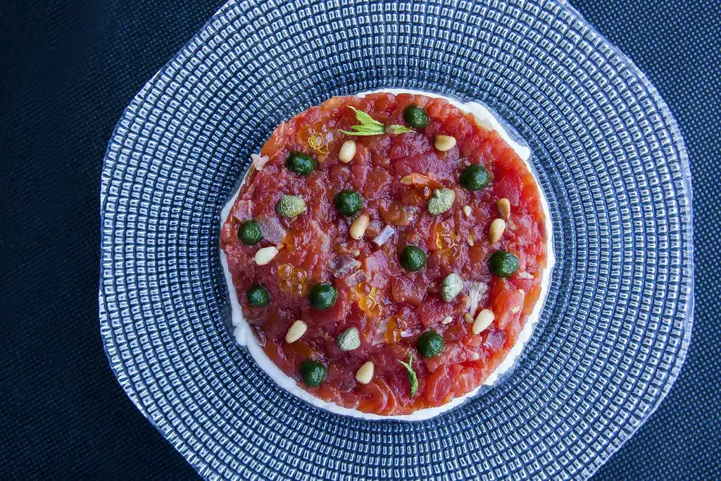 Tartar de tomate ahumado con emulsión de albahaca y granizado de vermut